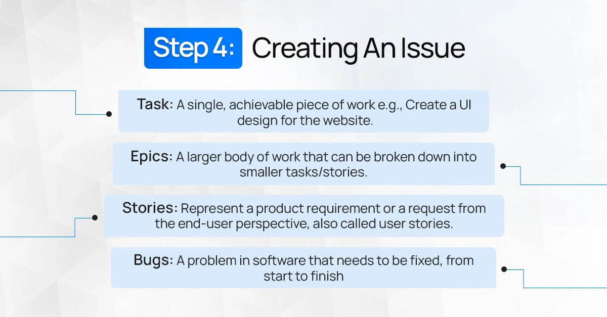 - Task: a single, achievable piece of work e.g., create a UI design for the website.