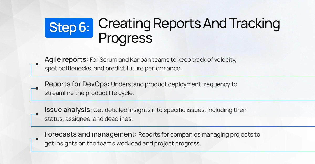 Jira has powerful reporting features to help you manage project progress and drive data-driven decision-making. Depending on your project, different types of reports in Jira include: