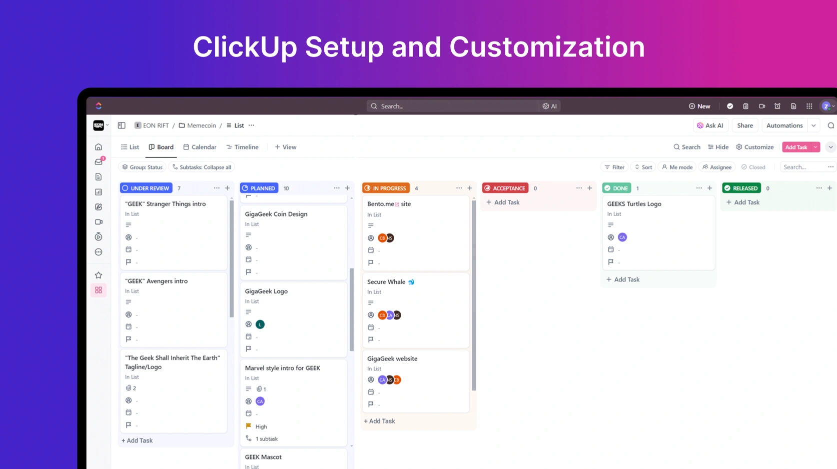 To address Eon Rift’s challenges, we implemented ClickUp, a comprehensive project management tool customized to meet the company’s specific needs. The solution was executed in the following steps: